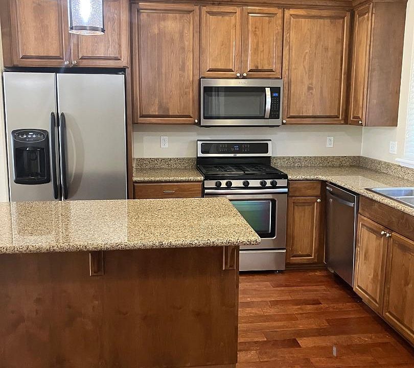 Central cooking islandElegant wood flooringCustom wood cabinetryStainless steel appliancesAbundant counter spaceModern appliancesGranite counter tops