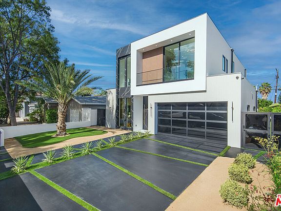 Wonderfully expansive contemporary home uniquely sited south of Ventura Boulevard, close to El Caballero Country Club in an enviable part of Encino. Two stories, with an architectural entry, 5132 Lindley Avenue boasts vast entertainment spaces, many with wood paneled walls and grand moonstone quartz that emulates the impressive exterior entrance. The living room is anchored with a custom-built floor-to-ceiling black and white fireplace, elegant paneling, and banks of modern bespoke doors offering backyard vistas to the pool and family room, a dining area, wine wall, and a beautifully appointed modern chef's kitchen with Miele appliances, 60" dual oven range and a generous marble pull-up waterfall island. This bright 5-bedroom, 6-bathroom home, completed in 2024, features a cohesive neutral color palette with unmatched quality throughout, including meticulous stonework, beaded wood panels, bespoke cabinetry, and large windows, complemented by wide-plank light oak flooring. All bathrooms feature intricate marble work and brass fixtures; the primary suite boasts a glass-fronted gas fireplace, marble shelving, a walk-in closet, and a stand-alone bathtub. A second ground-floor vocational space features a private additional living area. Oversized pocket doors lead to the outdoor heated pool and spa, and are surrounded by manicured gardens. Other amenities include wired speakers, a comprehensive security system, and WiFi extenders throughout the home, Apple iPad tablets to control home systems, and two AC units for optimal climate control.