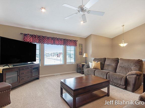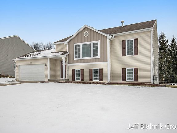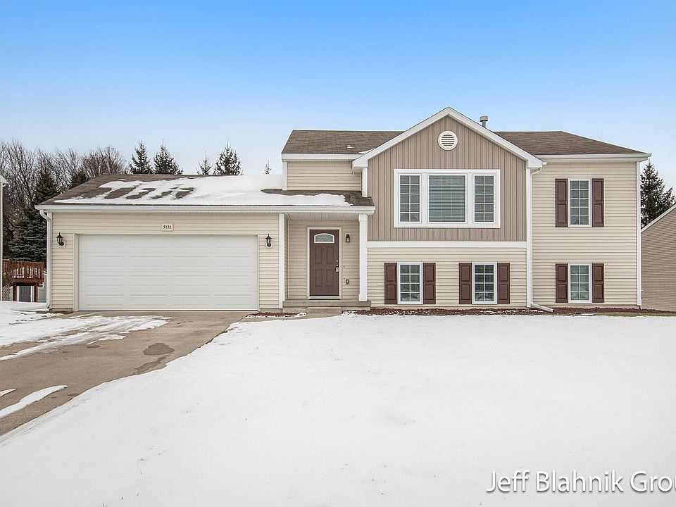 Don't miss this adorable, spacious 4 bed/ 2 bath home in Grandville schools! You will love the cathedral ceilings over the open living/kitchen/dining areas that have wide plank flooring, tons of natural light from the big windows & a slider to the large back deck, mosaic tiled backsplash, & large pantry. The master suite has an enormous walk-in closet & private entrance to the full bath. The lower level has two conforming bedrooms, full bath w/ dual vanities, utility room w/ washer/dryer hookups & built in shelving, & family room w/ projector, screen, & surround sound w/ subwoofers that makes an impressive home theatre which will stay w/ the house. All of this in the Bluffs at Rivertown; a community w/ pool, club house w/ fitness center, tennis courts, & playground. See it today!