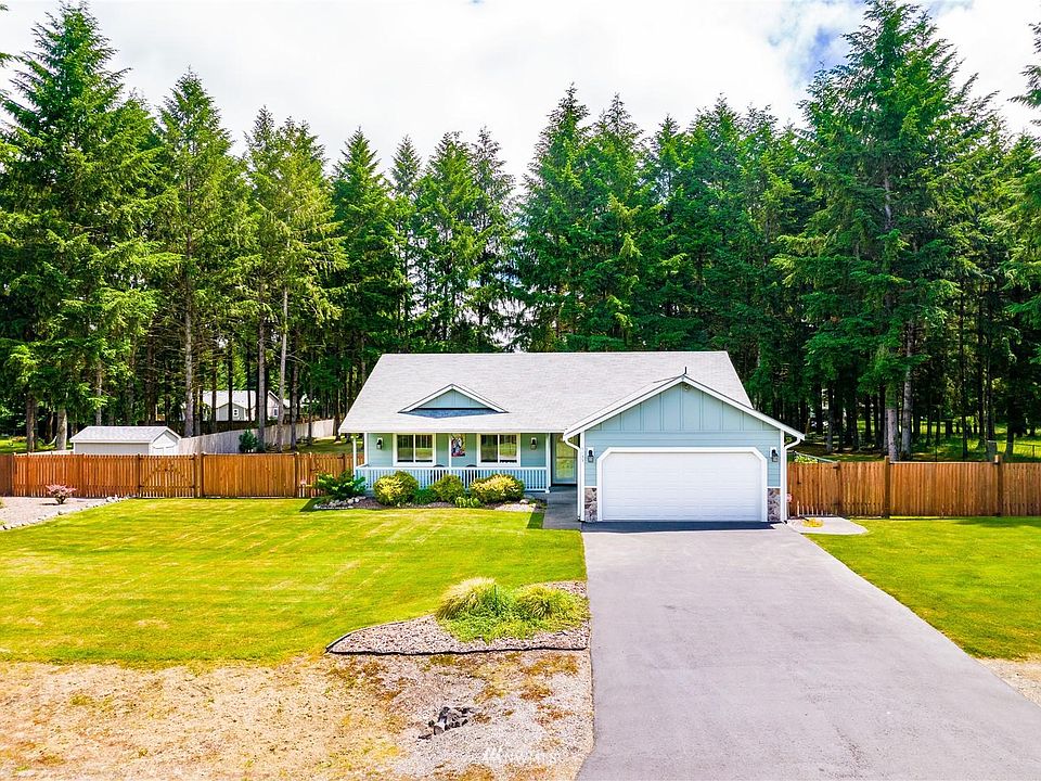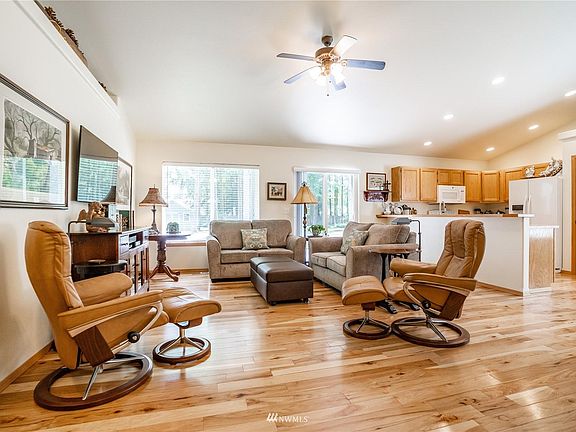 Wonderfully maintained Rambler in Prairie Pointe subdivision. 1,486 sf, 3bed, 2 1/2 baths, great room concept featuring vaulted ceilings, real wood doors & trim, heat pump w/AC, coiffured ceiling in primary bedroom. Nice appliances, propane Gas fireplace. Water heater newer and exterior paint in 2021. Exterior includes stone wainscot on garage front, large concrete covered front porch, moisture shield decking on back patio, black top driveway & front yard landscaping w/irrigation system. Spacious and secluded 3/4 acre lot with loads of privacy. 2 outbuildings included. HOA includes all water usage.