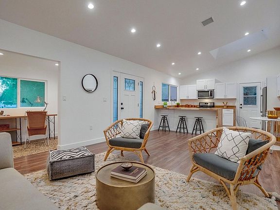 Inside, the light-filled living area features vaulted ceilings and skylights, creating an airy, open feel. A cozy alcove off the living room makes the perfect home office or creative nook. The kitchen, meanwhile, comes fully equipped with stainless steel appliances, including a gas range, dishwasher, microwave, and counter-depth fridge.