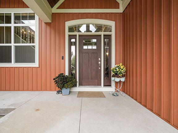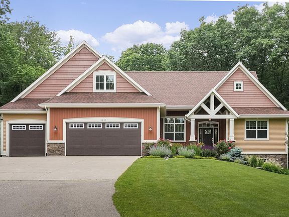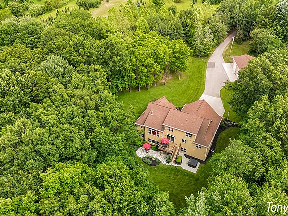 Enchanting home tucked on 3.38 wooded acres at the back of a private drive. Great room features custom built-ins, trayed ceiling and gas stone fireplace. Kitchen amenities include large center island, Granite countertops, hood fan, built-in double oven, beverage refrigerator, oversized walk-in pantry. ample sized back mudroom, main floor office and large laundry room. The main floor Primary Suite includes a soaking tub with tiled shower, rain forest shower head & walk-in closet. Upper level features 3 bedrooms and Jack-n-Jill bathroom. Walkout lower level has spacious family room with more custom built-ins, large recreation room, custom wet bar with 1/2 bath, theatre room, 2 bedrooms & full bath. Home has 9' ceilings on main and walkout levels, with Sonos surround sound throughout. The 3 stall finished garage has dual floor drain. 32x44 barn plus 12' overhang. Solid core interior doors, zoned heating, Hot tub on back patio.