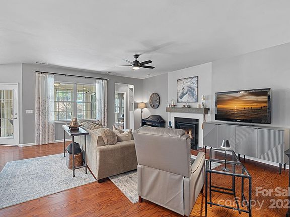 Beautiful ranch home in Tree Tops has a gorgeous outdoor living space in a private backyard. The Great Room is set around the gas fireplace and is open to the kitchen and breakfast area. Upgraded kitchen includes double ovens, gas cooktop, & a large island. Dining room can function as a home office or sitting room. Primary bedroom suite features a closet system, shower and garden tub. The second bedroom is spacious and has easy access to the updated bathroom with a tiled shower. Wood floors throughout the home. Enjoy the wooded backyard from the enclosed patio and the expanded paver patio, which features a built-in grill station. Tree Tops is a gated community with low SC taxes, is close to shopping, restaurants & more! Neighborhood clubhouse, outdoor pool, pickleball and tennis courts, walking trails, dog park, kayak launch & lake access. Plus, there are several cabins with activities for everyone including arts and crafts, games & a fitness center.