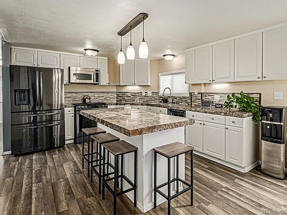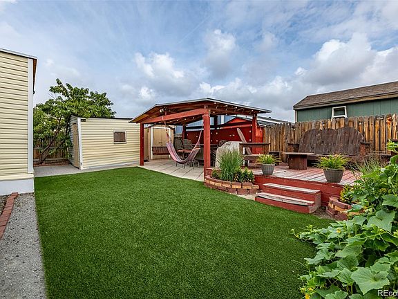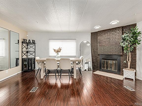 Welcome to this beautifully updated 4-bedroom, 2-bath home located in North County Village! From the inviting curb appeal with fresh landscaping and a covered front entry, to the stylish interior finishes, this home offers both charm and functionality. Step inside to a spacious open-concept living area featuring wood-style flooring, modern light fixtures, and a cozy brick fireplace as a focal point. The remodeled kitchen boasts sleek white cabinetry, tile backsplash, a large center island with seating, and updated appliances—perfect for cooking and entertaining. The living and dining room have high end Hunter Douglas motorized light filtering shades with room darkening liner that will stay. Also all bedrooms have Hunter Douglas room darkening honeycomb shades that also stay with the house. Stay cool this summer with the A/C. The primary suite offers a relaxing retreat with a ceiling fan, generous closet space, and an en suite bathroom with tiled shower surround. There are 3 additional bedrooms providing plenty of flexibility. Plus, the outdoor bonus room addition can be used as a workout room, craft area or more! Laundry room and washer and dryer included. The new roof was installed in 2024. Outside, enjoy your private backyard oasis! A covered patio, pergola, and custom deck with built-in seating make it ideal for hosting barbecues or simply relaxing. The fenced yard offers room to garden or play, plus the sheds offer plenty of additional storage for all your extras. Bonus, 2 off street parking spaces plus a built-in hidden storage for the trash bins. Community amenities to enjoy are a Playground, Clubhouse and Swimming Pool. RV storage also available with a monthly fee. Conveniently located near major highways, shopping, dining, and parks and trails, this home combines comfort and convenience in a fantastic Denver location.