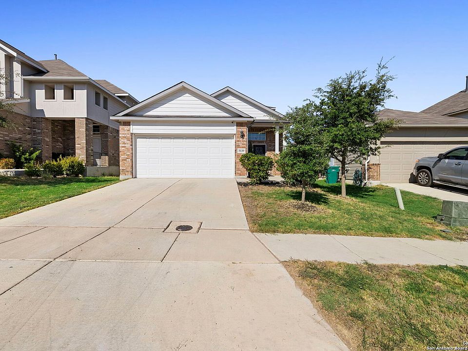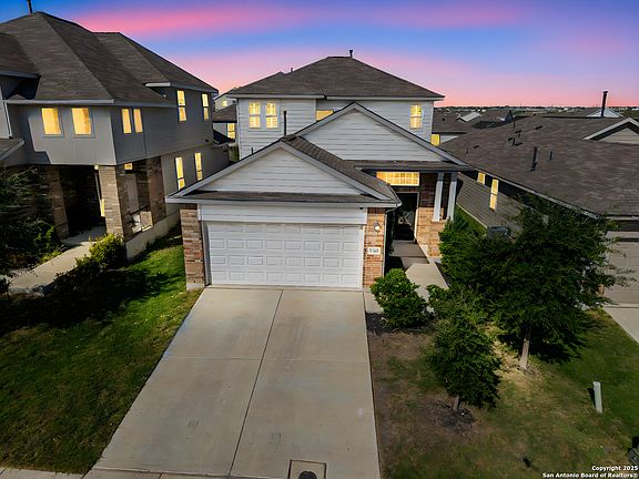 Welcome Home to Comfort, Style, and Convenience! Step into this cozy home featuring high ceilings and sleek laminate flooring throughout the main living areas, creating an open and inviting atmosphere perfect for everyday living and entertaining. The chef-inspired kitchen includes granite countertops, a striking herringbone backsplash, stainless steel appliances, and an extended breakfast bar ideal for casual dining or hosting guests. Retreat to the spacious primary suite offering an oversized shower, dual vanities, and a generous walk-in closet. Upstairs, you'll find versatile flex space and well-appointed secondary bedrooms that offer comfort and privacy for family or guests. Enjoy outdoor living on the covered back patio overlooking a flat, usable backyard great for relaxing or play. Additional upgrades include a garage door opener, water softener, irrigation system, and more! Conveniently located just minutes from Loop 1604, Randolph AFB, shopping, dining, entertainment, downtown San Antonio and community amenities this well-maintained home is ready for YOU! Please have your realtor inquire about a possible VA to VA Assumable Loan with a 2.75 interest rate.