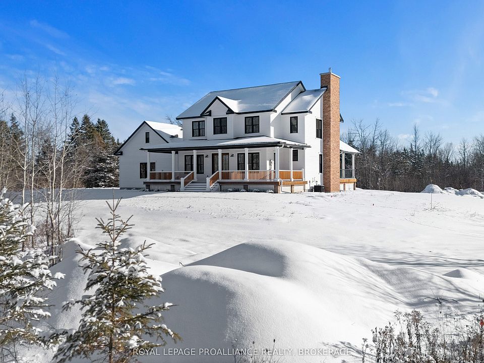 A opportunity to own one of Kingston Home Builders Associations award winning homes. Step inside this stunning new custom home by Concord Homes, one of Kingston's finest builders. A traditional farmhouse where timeless charm meets modern craftsmanship, this home was designed to feel as though it's always belonged here. From the classic peaked roof-lines to the warm hemlock floors and ship-lap walls, every detail invites comfort and style. Set on 2 acres of peaceful countryside, you'll love relaxing on the wide wraparound front porch or the back covered porch with views of nature all around. The main floor boasts 10-foot ceilings and a cozy great room centered around a reclaimed brick wood fireplace with a solid maple mantle. At the heart of the home is a beautifully designed kitchen, complete with a spacious center island, custom cabinetry, and a hidden walk-in pantry that keeps everything organized and out of sight. Upstairs, the second floor offers a convenient laundry room, four bedrooms, and a four-piece bathroom. The primary suite is a retreat with cathedral ceilings, skylights, and a luxurious ensuite. The finished walk-up lower-level features 9-foot ceilings, an additional bedroom, a huge media room, a wet bar, and a full bathroom with a steam shower and wet/dry sauna with red light therapy - creating the perfect home wellness retreat. For added convenience and space, the oversized three-car attached garage offers plenty of room for vehicles, hobbies, or extra storage. Located in a quiet country road just 10 minutes from all west end amenities.