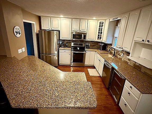 An open-concept living space, where the living room, kitchen, and dining area have been completely remodeled to create a warm, inviting atmosphere perfect for family gatherings and entertaining. The main sunroom off the living room fills the space with natural light, highlighting the home’s stylish updates.