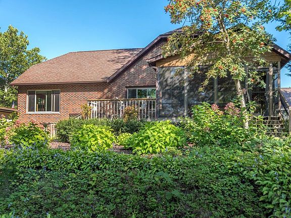 Brick 1 1/2 Story Home with a Lake View! Located on a quiet street across from Rock Lake. This 3 bedroom, 4 bath home has so much to offer. First floor master bedroom suite with walk-in closet and full bath with jetted tub. Great room and 3 season porch has a partial lake view. Kitchen with new quartz counters looks out to a beautifully landscaped fenced in backyard with pond & arbors among all the planting beds. And wait until you see the garage space. A 2 car attached garage and separate workshop area under the main level with access to the lower level of the home & huge newer 2 car detached garage with ample attic storage area. 1 Year Home Warranty included. Many more features you need to see to appreciate.