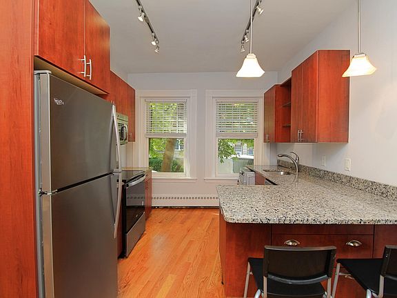 MUST SEE! Gorgeous, recently renovated first floor, 3 bedroom condo with open floor plan living room/dining area, lovely hardwood and stone accent flooring throughout. Unit has high ceilings, elegant track lighting and pendant lighting, large windows for lots of natural light and cross ventilation. New modern kitchen w/Island, granite counter tops and stainless steel appliances. Open living room/dining area space. Master bedroom with tiled ensuite bathroom! Spacious bedrooms...gorgeous bathrooms w/tiled tub/shower and fan. Washer/dryer in unit/kitchen. Heat and hot water included! Cats OK. Close to Coolidge Corner, MBTA B & C Line, or Orange Line. #66 bus to Harvard Square, Cambridge, or Coolidge Corner. Assigned to the Devotion School approximately .5 miles away. See Virtual Tour Video and Floor Plan attached. Vacant and easy to show, even on short notice. Call or email office for showings!