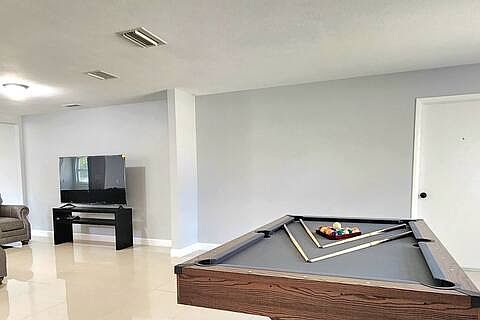 Bright, open living space with large sectional couch, big-screen TV, and pool table