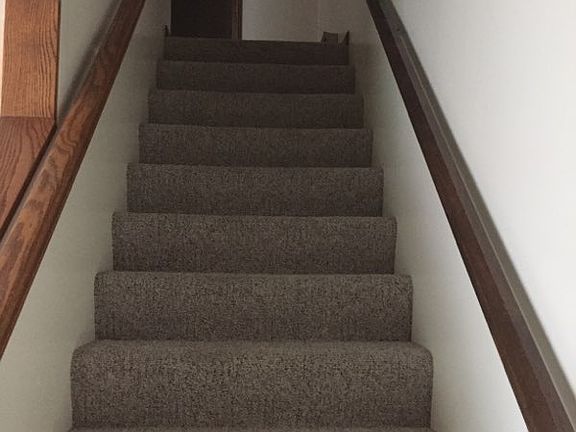 Two bedroom, one bath townhouse. The first floor includes kitchen, dining and living areas. The second floor includes bedrooms and a bathroom.