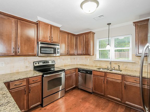 The kitchen pairs function with warmth, featuring rich wood cabinetry, granite countertops, and stainless steel appliances. A breakfast bar and formal dining area provide multiple spaces to enjoy meals, while large windows invite plenty of natural light.