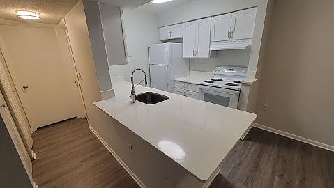 Newly renovated, Quartz countertops, white cabinets and appliances. 2nd floor unit with carpet and balcony, AND stackable washer/dryer!