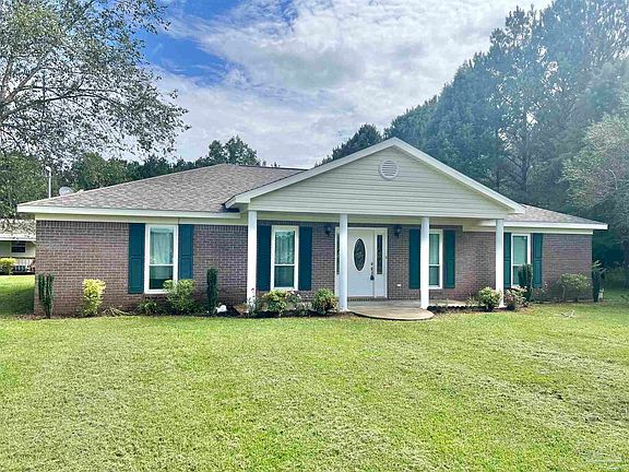Discover the perfect blend of peaceful rural living and convenient access in this charming brick home situated on over 2 acres just 15 minutes from downtown Atmore, AL, and 30 minutes from Pensacola, FL. Enjoy breathtaking views of lush woodlands and well-maintained crop land from the spacious screened back porch, featuring a dedicated cookout nook perfect for outdoor gatherings. The open-concept floor plan thoughtfully separates the primary ensuite bedroom and private bath from two additional guest bedrooms and a full bathroom, offering privacy and comfort. Each bedroom boasts walk-in closets for ample storage, while the oversized laundry room and walk-in pantry complement the fully equipped kitchen. Additional highlights include a detached 24' x 16' storage building with an attached double carport and a rear yard equipment shed—ideal for all your storage needs. Don’t miss this exceptional opportunity to own a meticulously maintained home in a serene setting! ALL SQ. FOOTAGE AND DIMENSIONS ARE APPROXIMATE AND IS THE BUYER'S RESPONSIBILITY TO VERIFY.