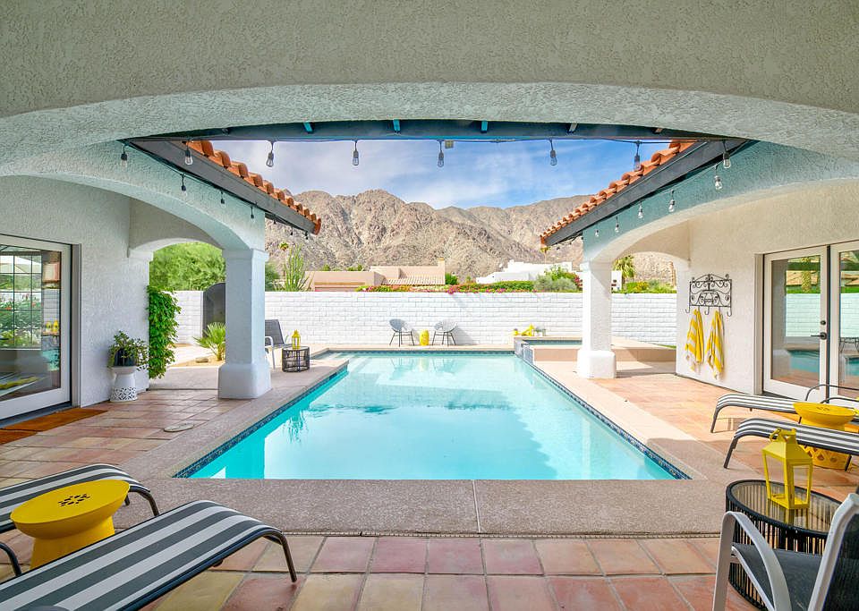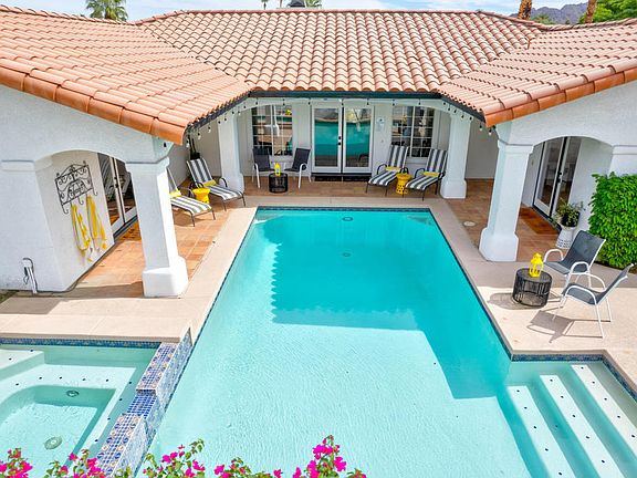 ACCEPTING Back-Up Offers. Indulge in the epitome of luxury with this Mediterranean-style entertainer's delight, located in the coveted Yucatan Cove of South La Quinta. Featuring a spacious and versatile floor plan that seamlessly blends functionality with sophistication. The kitchen/nook and living room combo boasts a breakfast bar counter and a fabulous sitting room, complete with wet-bar and countertop seating - allowing you to chat with guests while preparing dinner and refreshments. Double French doors open to the outside pool area, from the sitting/lounge areas and the primary bedroom, creating a seamless transition between indoor and outdoor living. Boasting a primary en-suite, two additional bedrooms, in addition to a bonus room that presents endless possibilities, serving as a home office, fitness or hobby room. A second living room/formal dining combo, complete with cozy fireplace, hearth and mantle to add your personal touch. The perfect balance of carpet and Saltillo tile enhances the Spanish/Mediterranean ambience throughout, creating an atmosphere of timeless elegance and comfort. Currently offered turnkey furnished per Inventory (Chandelier excluded.) Current owners have added many upgrades to the home, here are a few; HVAC, insulation, pool/spa equipment with multi-color lighting, epoxy garage flooring, non-slip coating around the pool on saltillo tile. Enjoy the serenity of a saltwater pool and spa, complemented by breathtaking mountain views.