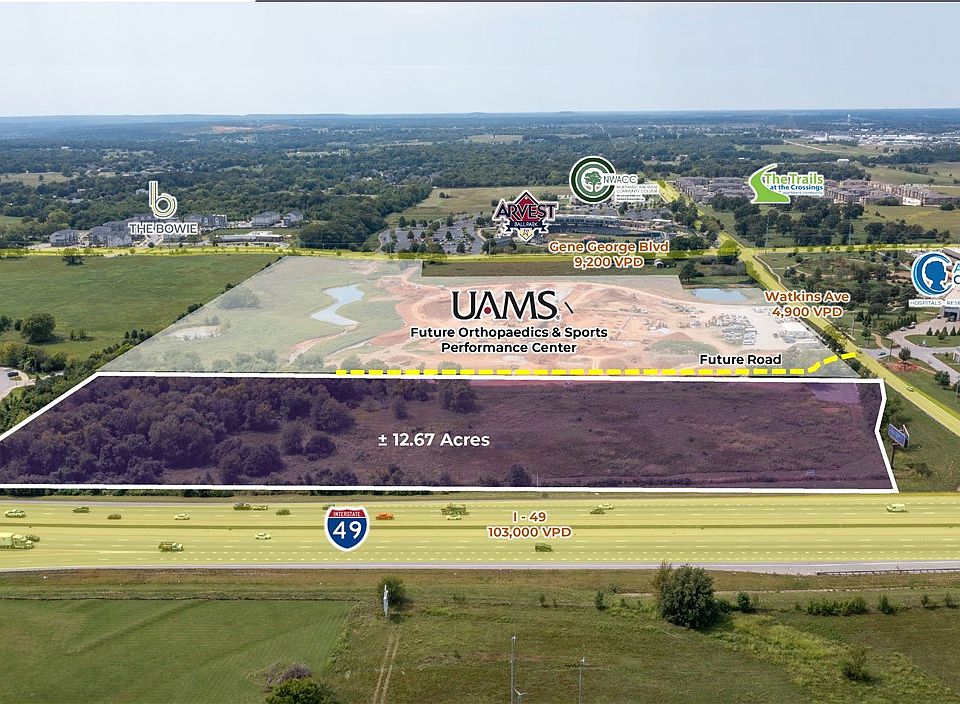 Exceptional visibility from I-49 (1,300 linear feet of frontage). The property is situated in the rapidly growing west Springdale market. One of the last properties in the area with primary I-49 frontage and surrounded by large scale developments such as Arkansas Children's Hospital, Arkansas Blue Cross/Blue Shield, UAMS. Favorable terrain for development.