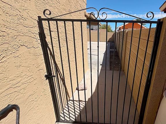 Custom iron gatesSpacious master bedroomOpen kitchenPrivacy wallsBreakfast barWalk in closetTile floors