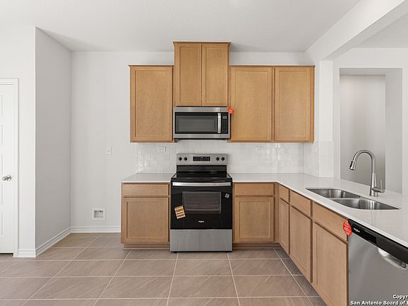 Discover comfort and style in this beautifully designed home featuring soaring 9-ft. first-floor ceilings. The kitchen is both functional and elegant, with Whirlpool stainless steel appliances, 42-in. Woodmont Dakota Shaker cabinets, a Daltile tile backsplash, and Silestone Lagoon countertops. The primary bath offers relaxation with a raised vanity, upgraded cabinetry, and a 42-in. garden tub/shower combo with Daltile tile surround. Decorative details include a 3-lite Continental entry door, Kwikset Polo interior door hardware, and Coastline ceramic tile flooring throughout the kitchen, bathrooms, and living room. Additional perks include a wireless security system, fully sodded yard, and an automatic sprinkler system for easy outdoor maintenance.
