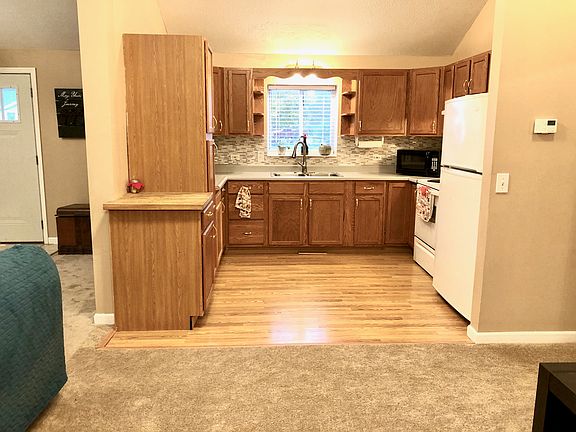 Ranch style home with open concept and vaulted ceilings. Kitchen with loads of cabinets. New carpet. 1/2 acre lot and detached garage. No Steps!