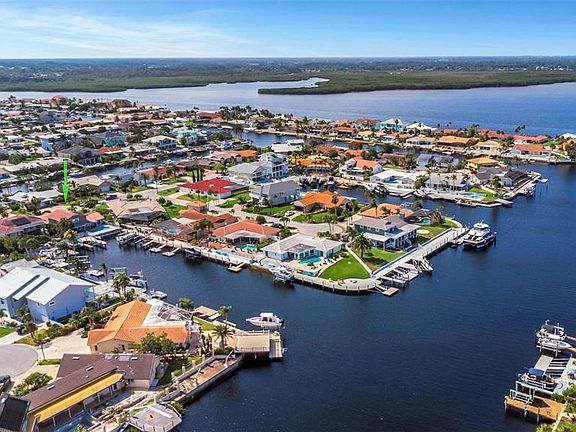 HELLO GORGEOUS!! Live every day like you are on vacation in this SPECTACULAR WATERFRONT PARADISE with unmatched luxury finishes! Luxurious Waterfront Retreat with Premium Upgrades, DIRECT GULF ACCESS & Spectacular Sunsets. Move-in ready and meticulously remodeled, this exceptional 4-bedroom, 4-bath WATERFRONT home in the coveted Gulf Harbors/Flor-A-Mar community offers over 3,100 square feet of refined coastal living. With deep-water Gulf access, premium finishes throughout, and spectacular sunset views over the water, this property is a rare find for those seeking both elegance and adventure. Enjoy 70 feet of waterfront, a private dock with 14,000 lb BOAT LIFT, JET SKI DOCK, and quick access to world-class fishing, sandbars, and open Gulf waters—ideal for the ultimate boating lifestyle. Inside, the home impresses with an open-concept layout, soaring ceilings, and energy-efficient LED lighting. The chef-inspired kitchen features custom KraftMaid cabinetry, granite countertops, Samsung Bespoke AI Appliances, a walk-in pantry by California Closet Design, KitchenAid appliances, an induction cooktop, and an oversized peninsula with bar seating—perfect for entertaining. The great room dazzles with a marble fireplace and professionally installed surround sound audio system (also installed in the family room). This home offers TWO LUXURIOUS OWNER'S RETREATS, one on each floor. The main-level suite includes a spa-style bathroom with a gorgeous 25 sq ft walk-in shower, quartz countertops, and a solid wood closet system. The top-floor owners retreat showcases a marble en-suite bath and custom walk in closet. The second bath features a soaking tub, custom tile shower, dual vanity with granite counter tops. Upstairs also includes two additional bedrooms (or one plus a bonus room/home office) with generous closet space. Additional highlights include tray ceilings, crown molding, solid-core doors, plantation shutters, luxury vinyl plank and tile flooring, and smart home integrations (smart locks, thermostats, Ring system, and automated sprinklers). Impact-rated windows and doors THROUGHOUT home. Two OLED LG 4K TVs are included. Step outside to your private backyard oasis, where you’ll enjoy a resurfaced saltwater pool featuring a cascading waterfall spout, updated pool equipment, solar heater, paver patio, ambient LED lighting, outdoor ceiling fans and nightly displays of vibrant sunsets over the water. The dock features, composite decking, stainless hardware, and dedicated electric/water hookups—ready for your boat and water toys. All major systems have been updated, including electrical, plumbing, HVAC vents, hot water heater, insulation, impact-rated windows and doors, and a new 8-zone irrigation system. Garage includes a polyaspartic floor, new pvc baseboards and custom storage. No HOA. No CDD fees. INCLUDES ACCESS TO PRIVATE BEACH! Located in one of New Port Richey’s most desirable waterfront communities with great neighbors and unmatched boating access. Ask for the full list of high-end upgrades—too many to list! This is your chance to own a truly turn-key luxury waterfront home with dual owner’s suites and unforgettable sunsets. MOVE IN READY...This is YOUR HOME!