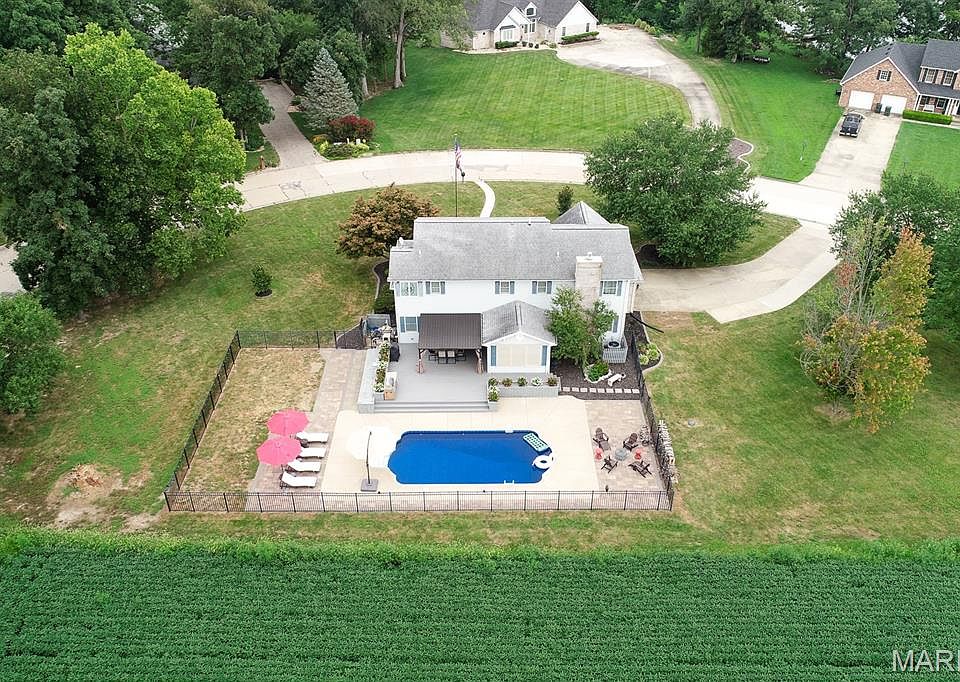 Tucked away on a quiet impasse in Wildwood Lake Estates, this updated 2-story retreat (2998 sq ft) blends privacy, space, & style on a serene 1.1-acre lot w/no neighbors behind. Main level showcases spacious great room w/fireplace, formal dining, cozy family room, powder room, & stunning sunroom bathed in natural light. The kitchen has center island, crisp white cabinets, & sleek new Samsung smart appliances. Upstairs, the primary ensuite offers a fireplace, dual vanities, jetted tub, separate shower/toilet room, & custom walk-in closet (9x10). Three additional oversized bedrooms (2 w/closet systems) share full bath w/dual sinks/vanities & private toilet/shower area. One bedroom includes an attached bonus room, perfect for an office or hobby space. Enjoy the convenience of upper-level laundry w/cabinetry & utility sink. Hardwood & ceramic tile flow throughout. Step outside to your own private oasis: composite deck, pergola, extended hardscaping, fencing, outdoor grill/fridge (w/propane line), & sparkling saltwater pool-all designed for relaxing & privacy. Lower level is unfinished (currently storage & exercise area) but plumbed for future bath, leaving tons of room to grow! Over $150K in recent upgrades including pool liner/equipment, electrical upgrades, front & back doors, tankless water heater, French drain, sump pump, garage door system, interior updates, & more. Full list in photos and Disclosures. 32 min drive to Scott AFB!
