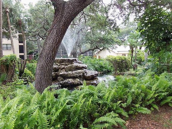 Really beautiful 3rd floor condo directly overlooking large fountain surrounded by lush greenery with clubhouse and lake in the background. New screening in Enclosed Florida Room. Air Conditioner is approx 2 years old and interior was recently painted. Eat-in kitchen. Master bedroom features huge walk-in closet. Inside washer and dryer. Being offered nicely turnkey furnished. Big recreation center with huge heated pool is located in courtyard area right behind the building. Gated community 24/7. Small dog up to 25 pounds or two cats or birds allowed. Decorated beautifully and move-in ready. Covered Parking. Quick possession is possible.