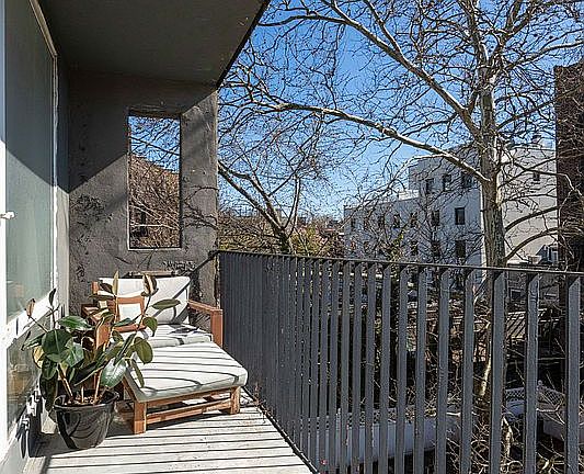 The living room and second bedroom offer northern exposures with captivating city vistas over a charming tree-lined street. The primary bedroom opens to the south-facing terrace, providing tranquil views of the building's communal garden below.