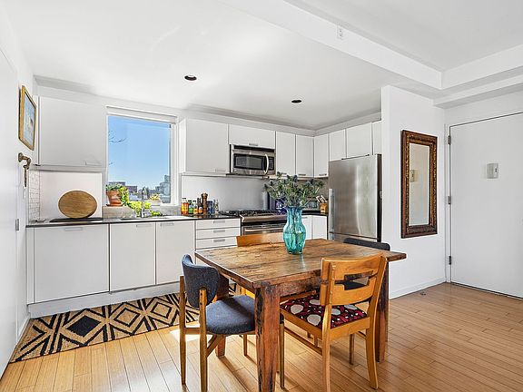 Residents of this esteemed condominium can enjoy a variety of communal spaces, such as a rooftop deck with panoramic views of Manhattan, the Statue of Liberty and Hudson River, a children's playroom/community room equipped with a kitchen and bathroom, an outdoor garden with barbecue facilities, and a dedicated bike room. The building welcomes pets, adding to its appeal.