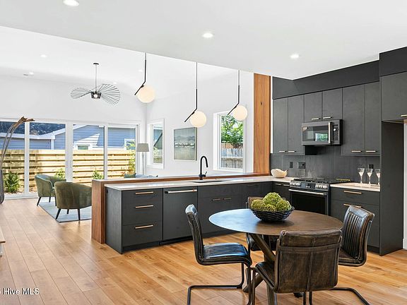 Ready to make the move to downtown Wilmington?! This stunning 3 bed, 2 bath home, developed by Sand Wave Modern Homes, is a true masterpiece of contemporary design that seamlessly blends with practical livability. Whether it's the tall ceilings, distinctive tile, GE Cafe appliances, custom live edge pantry doors, one of a kind wooden waterfall bar accent, oversized windows, massive walk-in closet, stylish light fixtures, or the roof top patio - you are going to fall in love! Behind the walls, you have 2x4 and 2x6 framing (very solid), solid core doors (noise reduction), foam insulation (energy efficiency - average utility bill is around $30!), insulation between walls (noise reduction), Hardie siding and trim (easy maintenance), Level 4 drywall finish (extra smooth finish), Sherwin Williams Cashmere paint (high quality with smooth, even finish - not builder grade), wood shelving in closets, and a gas tankless water heater (efficient, and endless hot water!!). All this to say - it's a very well built, low maintenance and energy efficient home! Enjoy the outdoor living spaces both upstairs on the rooftop patio or in the fenced courtyard, which is complete with a gas line for a fire pit or grill and an outlet for your bistro lights —a perfect spot for entertaining or quiet relaxation. Also a perk for downtown - this house has off street parking with a car port as well as a conditioned storage room. Exploring the neighborhood, you can experience the convenience of living just 2 blocks from the lively Brooklyn Arts District and its array of dining + social hot spots. This growing area is poised for appreciation as planned new homes and renovations continue and the social scene further expands! Live Nation's Amphitheater, only 6 blocks away, promises entertainment with great concerts and events throughout the year. The Pier at Port City Marina and Riverwalk downtown are also within easy reach. If interested, furniture is available for purchase outside of sale.