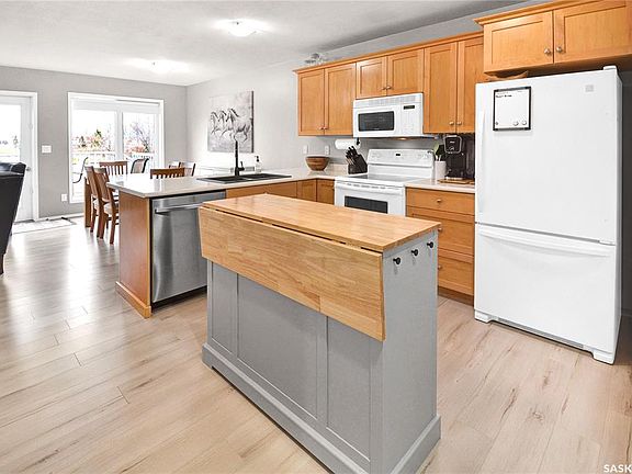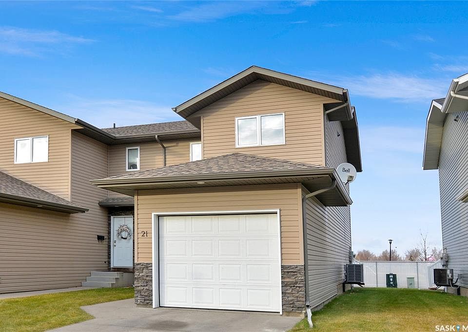 Welcome to this wonderful Warman 2 storey townhouse. Location of this unit cannot be beat, facing south with a single attached garage, and backing onto a public park, walking trails, Communiplex, library and school. Upon entering this home, you will find an open concept kitchen, dining and living room space with beautifully upgraded laminate flooring throughout that was installed in 2025. With maple cabinets in the kitchen and an accent island for additional counter space, storage and seating, large pantry, counter seating on the peninsula, upgraded countertop, sink, faucet and dishwasher, this kitchen gives you all you would need and more. The living space is bright with large windows and ample space for seating. The powder room was renovated in 2024 with new paint, faucets, mirror, custom shelving and light fixture. The deck is exceptionally large at 15’5” x 12’ on this end unit, providing you with additional outdoor entertainment space. The second floor features updated carpeting completed in 2022 and offers 3 good sized bedrooms and 4-piece bath with newer flooring, countertop, light fixture, faucet and mirror. The basement houses the laundry facilities and is unfinished and ready to be developed with rough-in plumbing for another bath. The furnace and water heater were updated in 2024, with central air added in 2022. Condo fees are $285.00/month. With all of the recent updates, the only thing the new owner would have to do is move in.