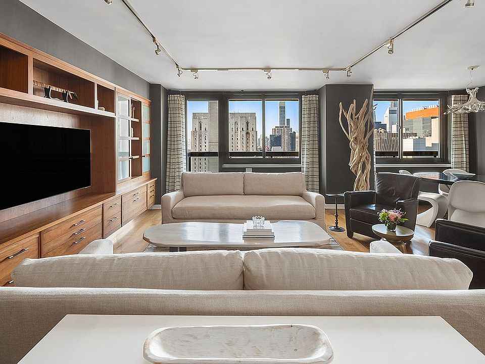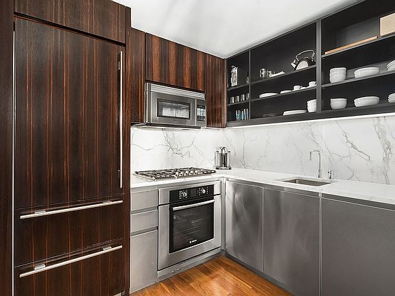 Entering this incredible home, you are immediately met with sweeping southern city skyline views through a wall of oversized windows. With ample space for living and dining, the spacious great room leads to a balcony with views east to the East River and west across 72nd Street. Designed with an eye to efficiency as well as an impeccable design esthetic, the custom chef’s kitchen features Calcatta marble counters, ample storage and a suite of high-end appliances by Sub-Zero, Miele, Viking and Bosch. A powder room, an enclosed laundry room with stacked Bosch W/D, and a large crystal closet complete this area.