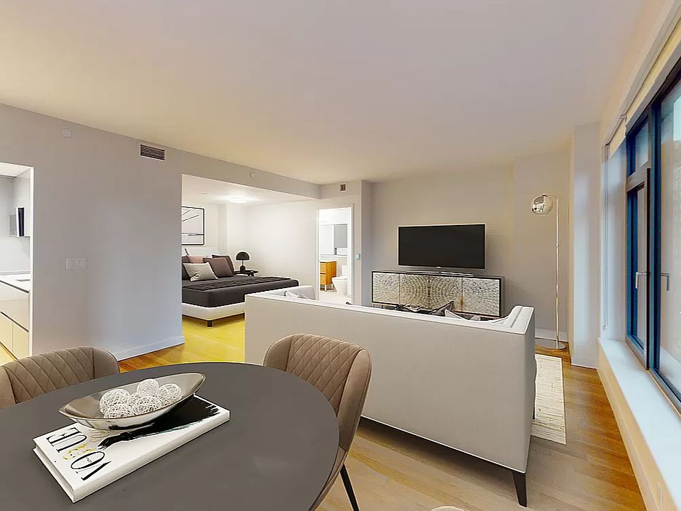 A long entry hall leads past a wall of closets and a windowed chef's kitchen into a square shaped open living space with a wall of floor to ceiling south facing windows. Hardwood floors add a warmth and richness throughout the home. The kitchen is top line with elegant Fisher Paykel induction cooktop and convection oven, microwave, paneled fridge and dishwasher. Dekton countertops are surrounded by Italian paneling enclosing great storage above and below. The bathroom has a full tub and shower, integrated Convivium sink and vanity, oversized mirror and sleek custom tile from Porcelanosa. There's also a washer-dryer closet. CONVIVIUM offers a thoughtful suite of luxury amenities from the landscaped garden courtyard off the lobby to multiple lounge spaces, outdoor cooking areas, game room, 24-hour Fitness Center, co-working spaces, a dog run and the greatest common roof deck on the UES.