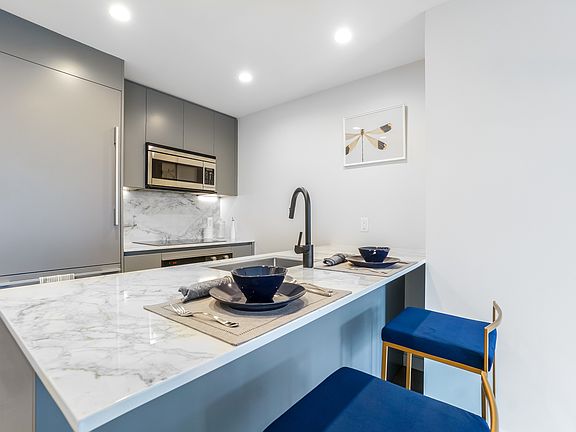 CONVIVIUM is NYC's newest luxury rental tower, located on East 86th St and York Ave. Designed for health, well-being, total comfort and upscale luxury, this new development also introduces the most airtight construction to reduce carbon footprint and lower monthly utility costs. The apartments at CONVIVIUM are intended for flexibility. This unit is a One Bedroom with an open flow between rooms for light and air. All homes feature open designer kitchens with Dekton countertops, Italian cabinetry, Fisher Paykel appliances including dishwasher and microwave, and stone floors. Apartments have high ceilings and over-sized triple glazed windows that have been treated to provide thermal retention and complete noise abatement. Living areas have rich oak floors throughout, lots of natural light and central climate control. Bathrooms include custom sinks, made for CONVIVIUM by Porcelanosa, polished chrome water fixtures from Dornbracht, deep soaking tubs and hand-held shower heads as well as one piece Duravit toilets. Each bath has Italian cabinetry and large mirror. Also, every home has its own in-unit washer-dryer. We are open daily, offering both in-person and FaceTime tours. Contact us today to schedule your visit!
