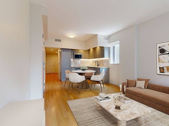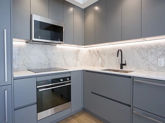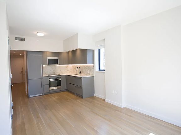 This corner studio is all light and bright with south exposure! An entryway leads past a sumptuous bath, a washer-dryer closet and into the sunfilled open living area with a smart corner kitchen fully loaded with top of line appliances and luxury finishes. Be inspired by the Fisher Paykel induction cooktop, stove, microwave and fridge. Dekton countertops and solid core Italian cabinetry tie the sleek contemporary look together. Natural oak floors and over-sized floor to ceiling windows provide a feeling of warmth. The bathroom features a custom integrated sink and vanity from Porcelanosa, with elegant tile work and Dornbracht water fixtures. There's a full tub and shower.