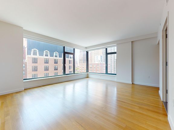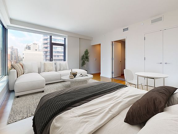 This amazing studio is all light and bright and ready to call home! An entry foyer leads past a windowed gourmet kitchen and opens into an open square studio with floor-to-ceiling windows wrapping two sides. The open south and west exposures make this a sun lover's dream! The kitchen features Fisher Paykel induction cooktop, oven, microwave and fridge, wrapped in Italian paneled cabinetry with elegant under-cabinet lighting and Dekton countertops. The bathroom has a full soaking tub and shower, featuring Dornbrach water fixtures as well as a custom bathroom sink from Porcelanosa, integrated into a paneled vanity. There is also a washer-dryer closet in the bathroom. CONVIVIUM offers a thoughtful array of luxury amenities including a 24 hour fitness center, multiple lounge spaces, a garden courtyard and the greatest common roof deck on the UES! This beautiful home may be seen by appointment.