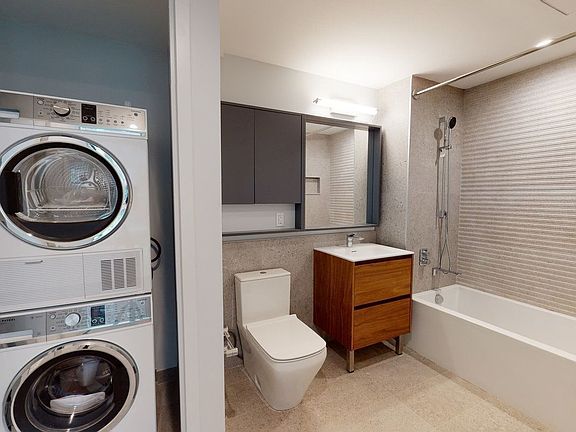 CONVIVIUM is the Upper East Side's newest and most high design luxury rental tower, now leasing for August and September occupancy. Here's a beautiful, comfortable and elegant over-sized studio where everything is brand new and never before used! Enter a long entryway past a high-end Fisher Paykel kitchen with dishwasher and microwave, Italian paneled cabinetry, Dekton counter tops, built-in led lighting and designer faucet and sink. Open into the spacious living quarters, with floor to ceiling triple glazed windows, which retain climate and abate sound from outside. Rich natural oak floors add warmth to the space, and there is a spa inspired tile bathroom with washer-dryer. The bath has a deep soaking tub with polished chrome shower, large vanity with custom sink, Dornbracht water fixtures, italian cabinetry and a one-piece Duravit toilet. CONVIVIUM is the winner of NYSERDA's Buildings of Excellence award for its Passive House design, sure to save money on utilities while reducing its carbon footprint to almost zero! The large amenities package includes numerous indoor and outdoor lounge spaces, a co-working and library space with stone columns and paneled walls, a media lounge, pet playground, dog spa, bike room, video arcade and a breathtaking roof deck with 360 degree views of the city and the east river. Our leasing is now underway, and we'd love to welcome you for a tour - please contact us for a specific appointment.