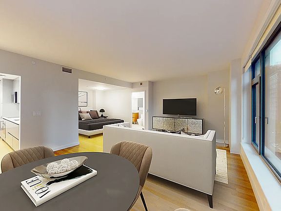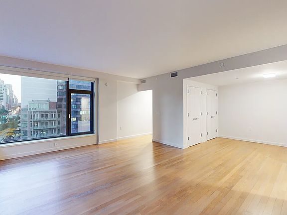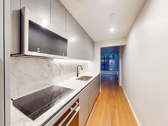 This is a beautiful and spacious alcove studio. A long entry hall leads past a wall of closets and a windowed chef's kitchen into a square shaped open living space with a wall of floor-to-ceiling south facing windows. There's a double closet off the living area. Hardwood floors add a warmth and richness throughout the home. The kitchen is top line with elegant Fisher Paykel induction cooktop and convection oven, microwave, paneled fridge and dishwasher. Dekton countertops are surrounded by Italian paneling enclosing great storage above and below. The bathroom has a full tub and shower, integrated Convivium sink and vanity, oversized mirror and sleek custom tile from Porcelanosa. There's also a washer-dryer closet. CONVIVIUM offers a thoughtful suite of luxury amenities from the landscaped garden courtyard off the lobby to multiple lounge spaces, outdoor cooking areas, game room, 24-hour Fitness Center, co-working spaces, a dog run and the greatest common roof deck on the UES.