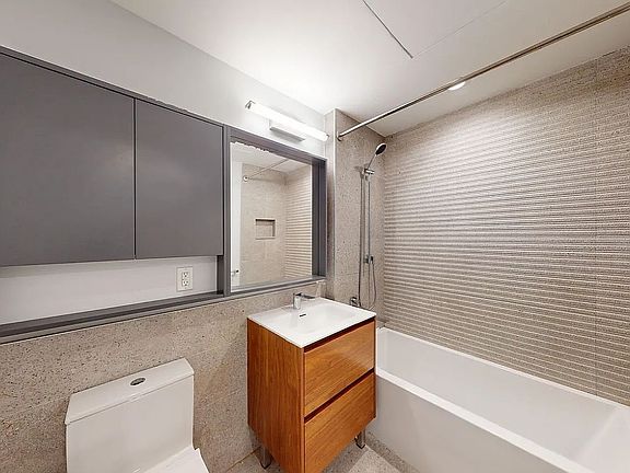 This unit has a super serene and efficient layout. It's compact but mighty. The unit runs wide across the rear of the building with defined kitchen, living, and sleeping areas. Featuring a top of line Fisher Paykel kitchen with induction cook top, paneled fridge and dishwasher, plus sleek Italian paneled built-ins. The kitchen opens to the living room which opens to a private outdoor balcony which overlooks the landscaped garden below and townhouse rooftops to the north. Living area stretches long into a separate bedroom space with floor to ceiling windows the whole length. The spa-inspired bathroom has a custom sink from Porcelanosa, polished chrome water fixtures from Dornbracht and a one piece Duravit toilet. Stone tiles and recessed lighting add to the elegant finish. Washer/Dryer in unit! The building offers 300 mbps wifi and a suite of luxury amenities including a fitness center, multiple lounge spaces, and the most amazing common roof deck on the UES. Small pets are welcome. $20 application fee per applicant applies.