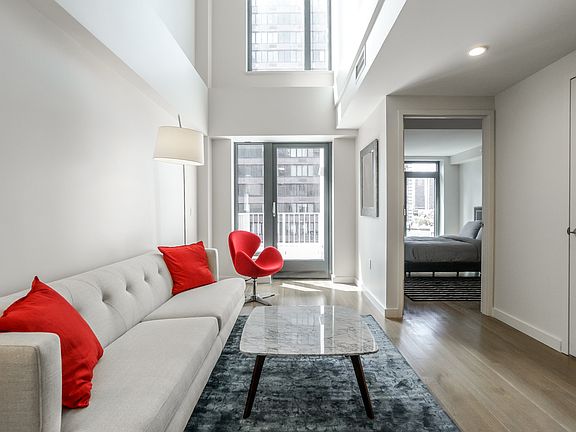 CONVIVIUM is the Upper East Side's newest and most high-design luxury rental tower, offering an array of flexible layouts built for health, well being and ultra comfort. Leasing is now underway for brand new homes ready for occupancy now. 3 mo/free GR = $7406.25 Duplex living at CONVIVIUM provides the best of two worlds--the privacy and independence of townhouse living combined with the convenience of living in a full-service amenity rich high rise. This two bedroom, two bathroom home is a design masterpiece with double-high ceilings in the living room, an inspiring gourmet kitchen, a sleek, distinctive staircase between levels, a home office, a downstairs bedroom and bath as well as an upstairs primary bedroom with ensuite bath. An entry foyer leads past an open dining area into a vertically impressive living room with 18' ceilings and two large window panels providing terrific natural light. A glass door leads to the lower balcony facing west over York Ave. The downstairs bedroom has a double closet and west facing window. The kitchen is gorgeous and spacious, with a central breakfast bar with Dekton counter tops and a stainless steel sink with polished chrome water fixtures. The cabinets have Italian paneling and lined interiors with soft-close doors and drawers all around. Warm, under-cabinet LED lighting adds dimension. Full-size appliances from Fisher Paykel include refrigerator, cook top and oven, dishwasher and microwave. The downstairs bath has a full tub and shower, with spa-inspired fixtures, large vanity and impressively tiled walls. A staircase leads to the second floor, where there's a spacious landing that could be a home office or den. There's a Fisher Paykel washer-dryer off this landing. The primary bedroom suite is also on this level, with a hallway leading from the landing, past the large primary bathroom and into the bedroom, which has a walk-in closet and glass door onto a large terrace overlooking York Ave and points west. The upper bath also includes full tub and shower, vanity, custom sink with polished chrome Dornbracht water fixtures and a one-piece Duravit toilet. CONVIVIUM offers a wide array of amenities from cellar to rooftop. There's a 24-hour fitness center, multiple lounge areas indoors and out, featuring an enormous residents' lounge with event kitchen and co-working - library space on the second floor. There's also a media lounge, play room, video and pinball arcade, pet spa, dog run, duplex garden terrace and a breathtaking roof deck with 360 degree views of NYC and the East River. We offer tours daily by appointment - contact us today for your private showing!