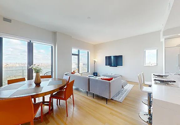 The top of CONVIVIUM offers this bright 2 bedroom 2 bathroom Penthouse, with sweeping views, private outdoor space, a top of line gourmet kitchen with Miele appliances, and washer/dryer in unit. Incredible natural light and wide exposures including amazing views across the East River bend! The contemporary design is sleek and glamorous with extra high ceilings, over-sized balcony, natural hardwood flooring throughout the apartment, designer water and lighting fixtures, artistic hardware and excellent storage. The primary bedroom features a large ensuite bath with glass and marble shower as well as a wall of windows overlooking the East River. The apartment features built-in Sonos audio and California Closets throughout. This is an occupied home, and we are showing by appointment only for June 7 occupancy.