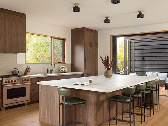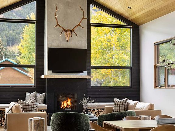 This contemporary apartment in Jackson, Wyoming, showcases a thoughtfully designed open-concept layout. The kitchen boasts sleek gray cabinetry, white quartz countertops, and high-end stainless steel appliances. A large island with pendant lighting serves as both a dining and workspace. The living area features a comfortable sectional sofa, fireplace, and floor-to-ceiling windows offering stunning mountain views. The bedroom is elegantly furnished with a king-size bed and ample natural light. Two luxurious bathrooms feature modern fixtures, including a glass-enclosed shower and soaking tub. Throughout the space, mountain-inspired artwork and a neutral color palette create a serene ambiance, while wood-look flooring adds warmth to the contemporary design.