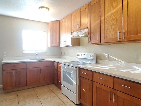 Fresh paintTile floorsDeep sinkAll electric kitchensWhite appliancesStainless steel handlesRemodeled kitchen