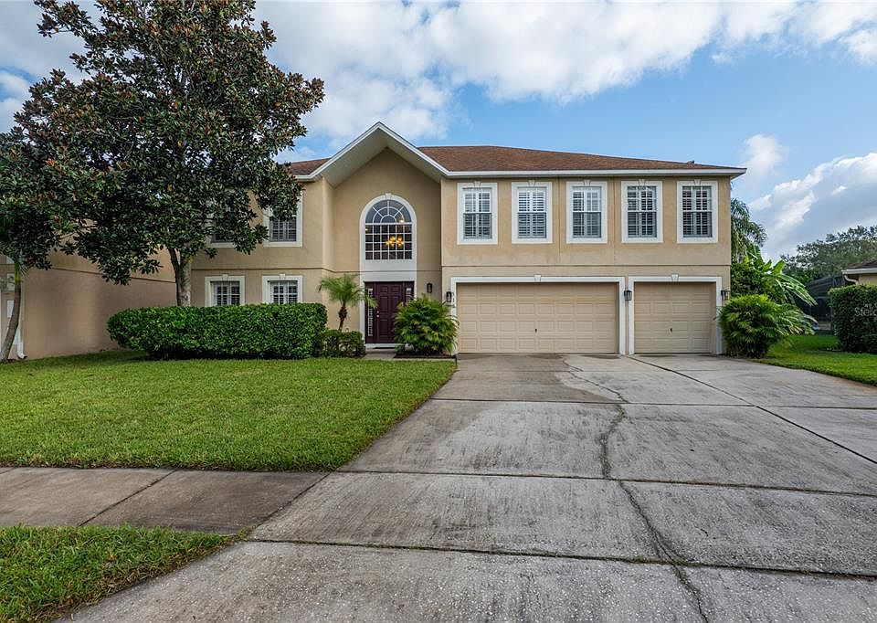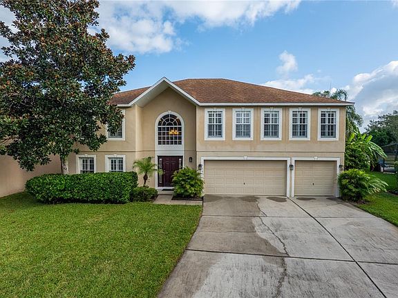 Step inside and prepare to be impressed by this beautiful 6-bedroom, 4.5-bath pool home nestled in The Trails. From the moment you walk in, the serene water views off the screened lanai set the tone for relaxation and elegance. Guests are welcomed through a private foyer with sleek 18-inch ceramic tile floors that lead into a formal living and dining room, perfect for effortless entertaining. The spacious kitchen is a chef’s delight, featuring 42-inch cabinets, a center island, double sinks, and a huge walk-in pantry. The open layout flows seamlessly into the family room, where rich dark hardwood bamboo floors create a warm and inviting atmosphere. Step outside to your own backyard retreat. Take a dip in the sparkling swimming pool, unwind in the hot tub, or simply enjoy the peaceful pond views from the large fenced yard. Downstairs, a second master suite offers privacy and comfort with its own full bath, ideal for guests or multi-generational living. Upstairs, you’ll find a generous loft area surrounded by five additional bedrooms, including the luxurious primary suite with tray ceilings, his-and-hers walk-in closets, a garden tub, and double vanities. Additional touches include a security system, plantation shutters, stainless steel appliances, and plush carpet in the living and dining rooms. Every corner of this home was designed for comfort, beauty, and effortless living.