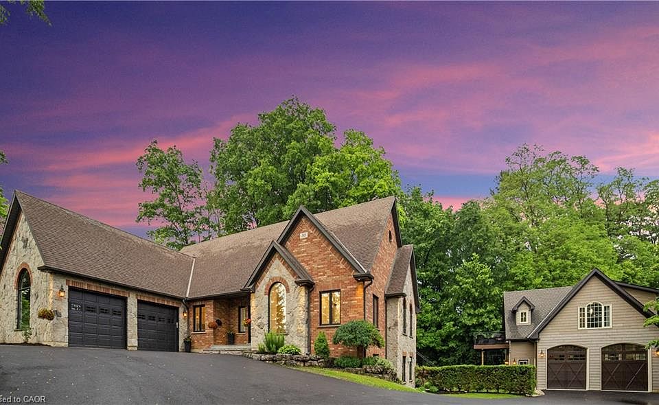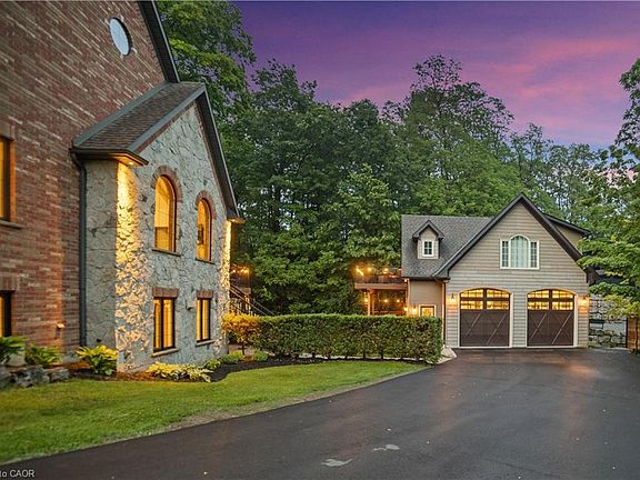 A rare find in Ancaster, this exceptional home sits on nearly one acre of private, wooded land, offering a serene and secluded setting while remaining just minutes from premier amenities and convenient highway access. The expansive lot offers ample space for a pool or additional outdoor features, blending luxury with nature and privacy. With over 5,100 square feet of total living space, this impressive residence features 8 bedrooms, 6 bathrooms, 3 full kitchens, 3 laundry facilities, and 5 gas fireplaces—perfectly suited for executive living, small business owners, or multi-generational families. No need to escape to a cottage for calm and tranquility as it’s all out your back door. Incredible Muskoka tree rich feel privacy with no visible neighbors off the large back deck, this property really has to be seen to feel the class, calm and comfort that is seeped through it. Despite its generous size, the property is surprisingly low-maintenance thanks to beautifully designed perennial gardens and the natural landscape of the wooded lot. The main home has been thoughtfully and artistically remodeled with a rustic, contemporary design, showcasing high-end finishes throughout. The in-law suite enhances the home's flexibility and includes 2 bedrooms, 1 full bathroom, a modern kitchen with stainless steel appliances, laundry facilities, and its own private living space. A standout feature on the property is the custom detached garage, equipped with a hoist, extensive cabinetry, and a full workshop setup. Above the garage, you'll find an additional 887 square feet of living space that serves beautifully as a guest house or second in-law suite, complete with 2 bedrooms, 1 bathroom, a modern kitchen with stainless steel appliances, laundry facilities and deck. This is a truly one-of-a-kind offering in Ancaster that won’t last long. Book your private viewing today—because once you see it, you’ll want to make it yours.