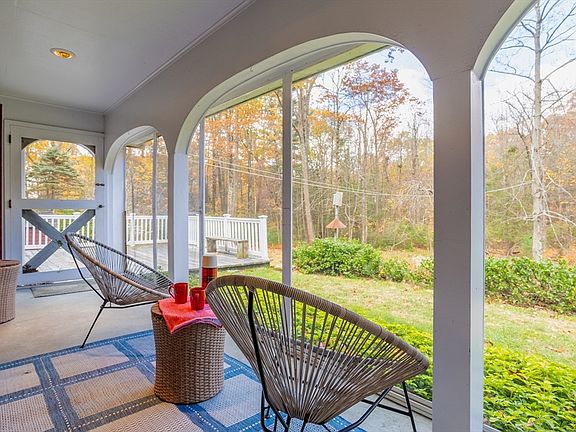 Wood burning stoveScreened porchDeck and porchCircular paved driveBeamed ceilingReclaimed barn-board wallsHardwood flooring