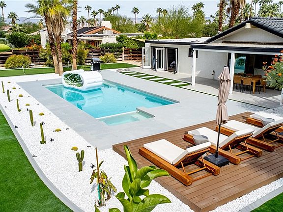 Welcome to 515 N Burton Way, your private oasis in the charming Oasis Del Sol neighborhood. Soak in the desert sun, mountain views, and stunning California sunsets from a backyard designed for relaxation featuring a sparkling heated pool and spa, a spacious terrace with a 20-foot floating deck, cozy fire pit table, and two hammocks overlooking 2,100 sq ft of brand-new artificial turf. A 4-hole putting green adds a playful touch to this already impressive outdoor space.