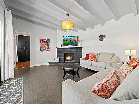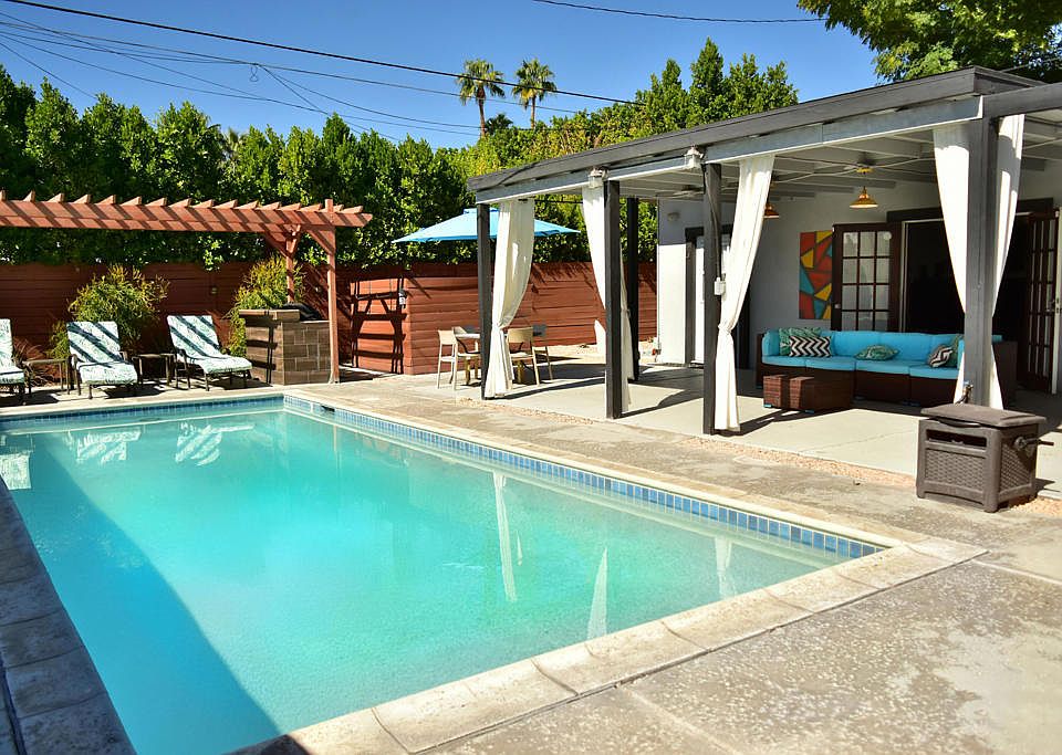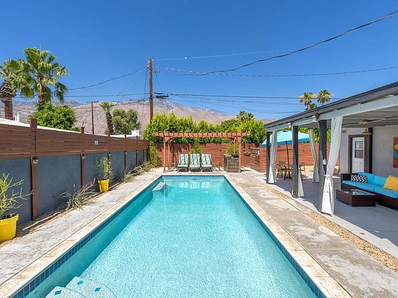 Make everyday a get-away in this charming MID-CENTURY Palm Springs home with popular Movie Colony East character and easy access to downtown. Enjoy leisurely days by the sparkling pool, perfectly positioned for maximum sun exposure and beautiful westerly mountain views. A pergola and cabana-style patio overhang create inviting spaces for relaxation. Ideal for full-time residency, weekend getaways, or seasonal escapes, the property has owned SOLAR and is very private with an enclosed front yard perfect for pets and family fun. There are also fruit trees and space for gardening enthusiasts. This 4-bedroom/2-bath home lives large with an updated open kitchen, breakfast bar, expansive dining/family room, and cozy living room with fireplace & French doors opening to the patio/pool area. The primary bedroom offers direct access to the pool/patio and to an updated bath. Three additional bedrooms and guest bath easily accommodate guests, with guest bath and 4th bedroom each opening directly to the pool/patio. Additional highlights include a one-car attached garage, separate laundry room, and tile & laminate flooring throughout. Furnishings available per inventory. This is THE essence of relaxed Palm Springs living. No HOA fees in this neighborhood.