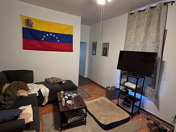 This is a 1-bedroom, 1-bath apartment located on the first floor of a multi-unit building in Ypsilanti's Historic East Side. The unit includes a private entrance, a living room, kitchen, and full bathroom.
