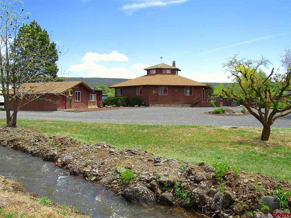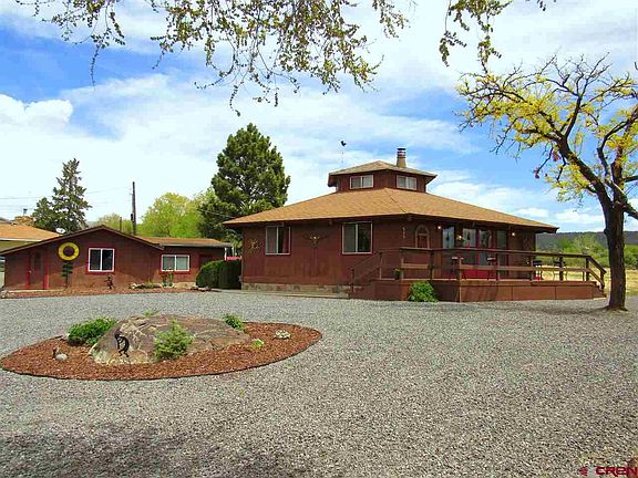 Unique, charming, perfectly located gem! This truly one-of-a-kind hexagon house sits on a half acre+ parcel with a seasonal stream, fruit and nut trees, xeriscaped and landscaped grounds plus room to park your RV. 3 bedrooms, 2 full baths plus a bonus room upstairs. The inviting layout wraps around the avant-garde floor plan, with an open kitchen/living area and central fireplace, making this mountain home perfect for relaxation or entertaining. Gorgeous tongue in groove ceilings throughout, oak baseboards, stairs and banister, new flooring, new kitchen appliances, new hot water heater, plus newer furnace. Too many renovations to list them all! Positioned a half mile from the quaint town of Cedaredge and at the gateway to the Grand Mesa, with unending beauty and recreation. Home awaits you!