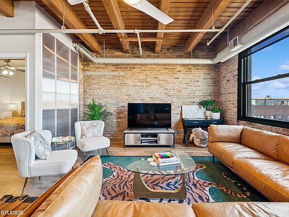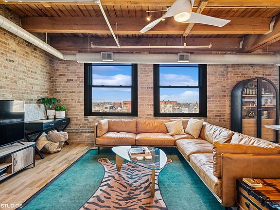 Experience the perfect blend of character and modern convenience in this stunning 2-bedroom, 1-bathroom historic timber loft condo in the heart of West Town. This home is filled with charm, featuring exposed brick walls, hardwood floors throughout, and soaring ceilings with oversized west-facing windows that flood the space with natural light. The updated kitchen boasts stainless steel appliances, an extra large island, granite countertops, and a wine/beverage fridge. The open-concept layout includes a stylish and functional workspace, ideal for working from home. The primary bedroom located off the living room offers an entire wall of storage, while the second bedroom provides flexibility as a guest room or additional workspace. Enjoy the convenience of an oversized laundry room with ample storage, and if that's not enough, there is also a storage cage included in the price. An outdoor parking spot in the gated lot is included. Residents have access to a shared rooftop deck with grills, tables, and breathtaking views of the Chicago skyline. With vibrant dining, nightlife, and public transportation just steps away - and easy access to Fulton Market, West Loop, and downtown - this West Town gem is not to be missed!
